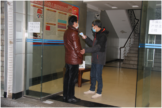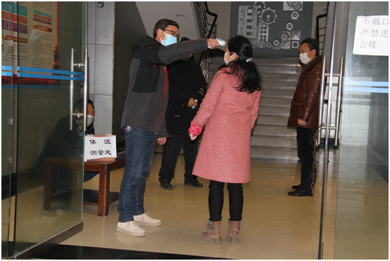 體溫正常,可以上樓了,體溫正??梢赃M車間了……每天早上8:30,下午14:00,位于102廠辦公樓一樓門廳、生產車間門口,工作人員手持測溫儀,認真仔細地給每一位上班的機關工作人員、生產車間員工測量體溫。消毒人員用消毒液噴灑重點區(qū)域。