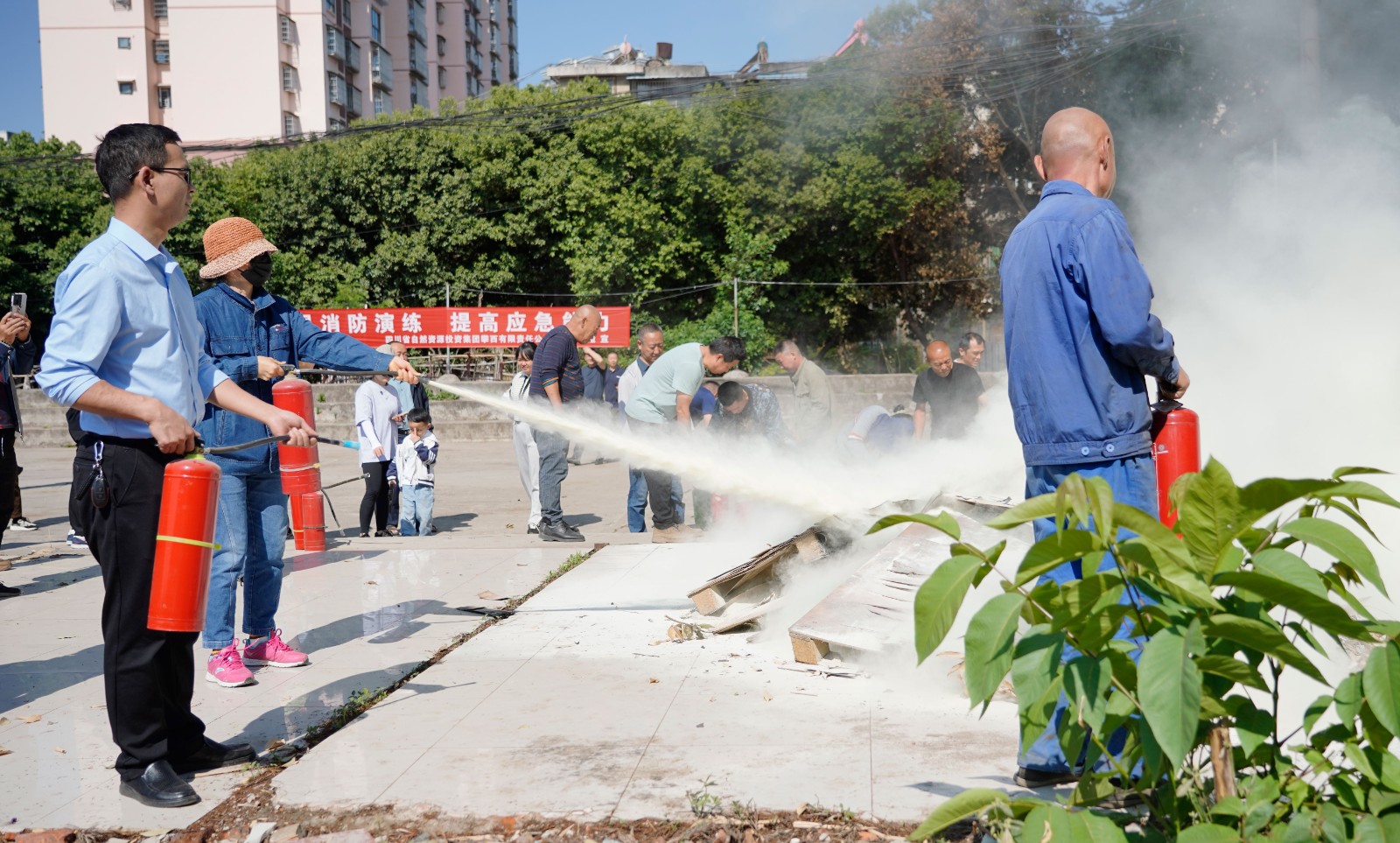 示范過程中,消防教官結(jié)合實操經(jīng)驗和案例分析,系統(tǒng)講授了火災(zāi)預(yù)防、隱患排查、應(yīng)急處理及消防器材使用等關(guān)鍵知識點。并以“提、拔、握、壓”四步驟為指引,演示了消防栓和滅火器有效性檢查及使用方法,手把手指導(dǎo)參訓(xùn)人員操作干粉滅火器,確保大家能熟練掌握消防安全技能和火災(zāi)撲救的基本要領(lǐng)。