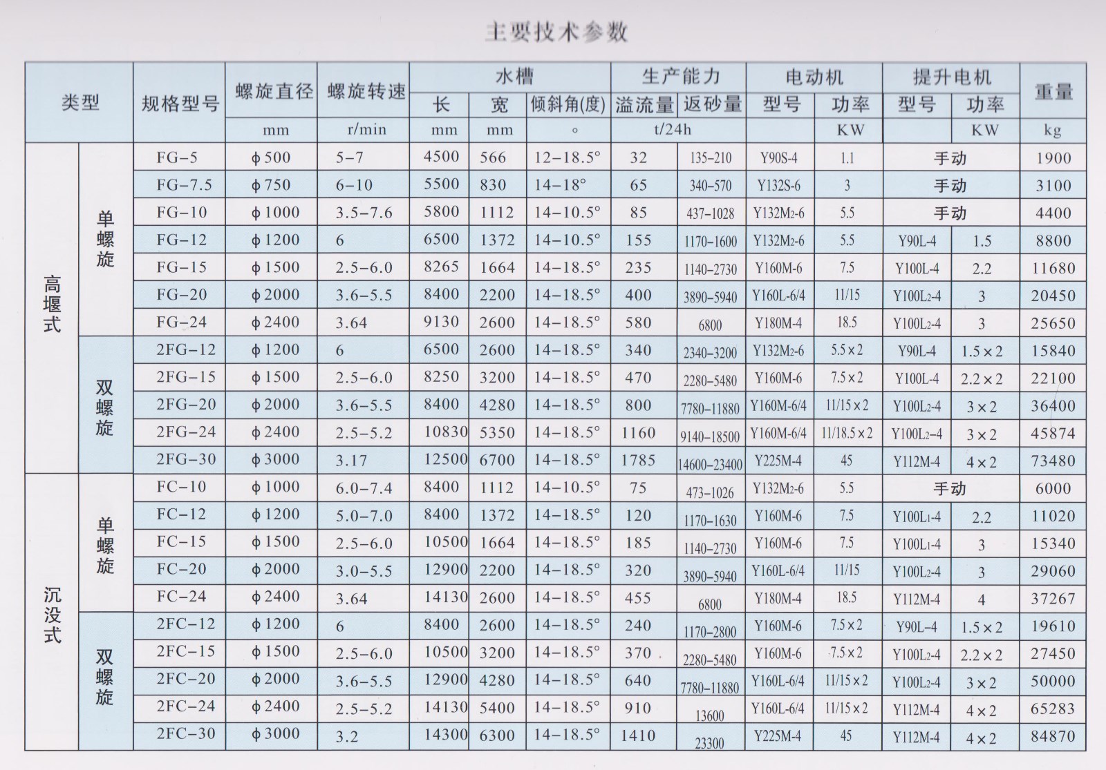 螺旋分級機(jī)按螺旋軸的數(shù)目可分為單螺旋和雙螺旋分級機(jī), 按溢流堰高度可分為高堰式、低堰式、和沉沒式三種。